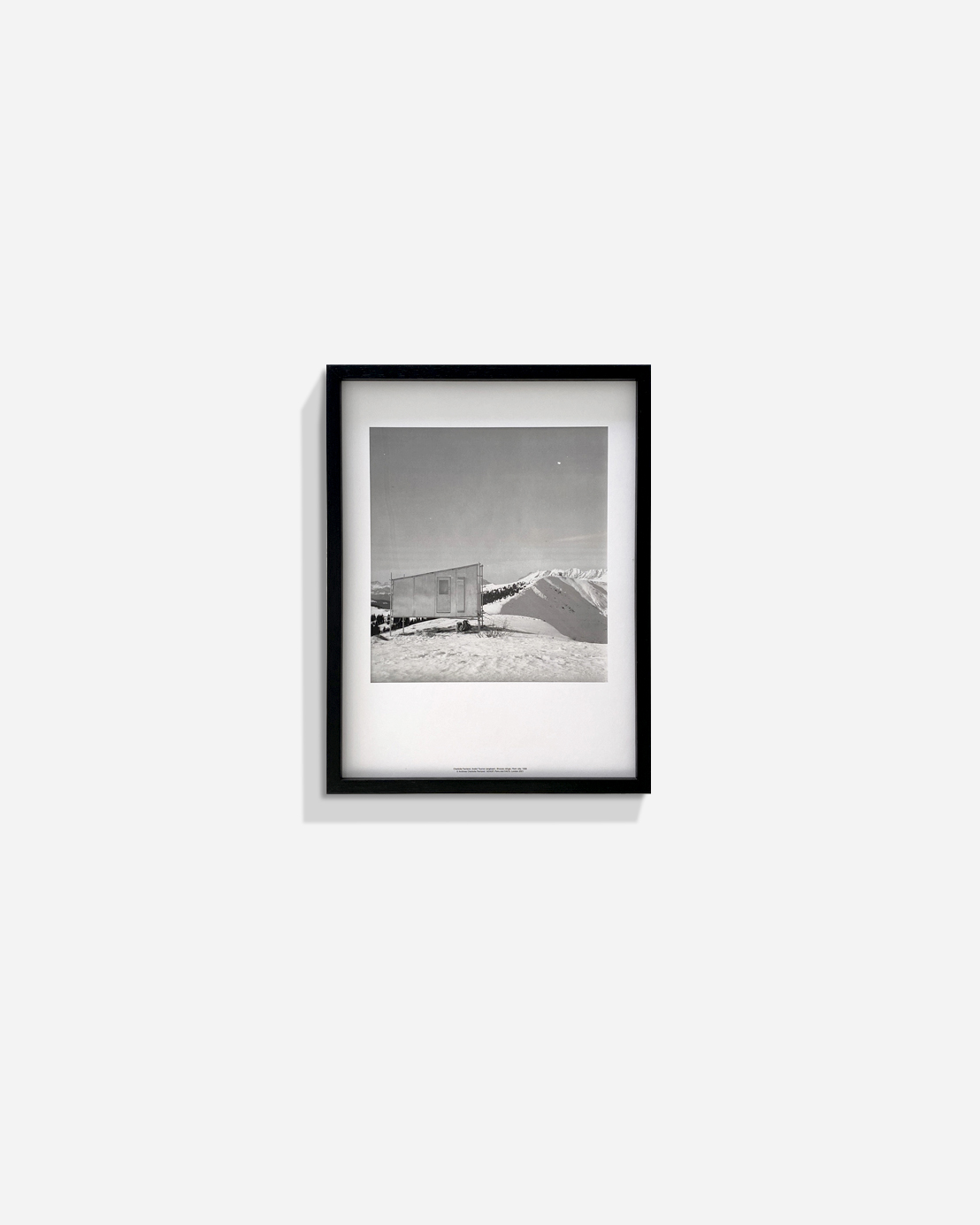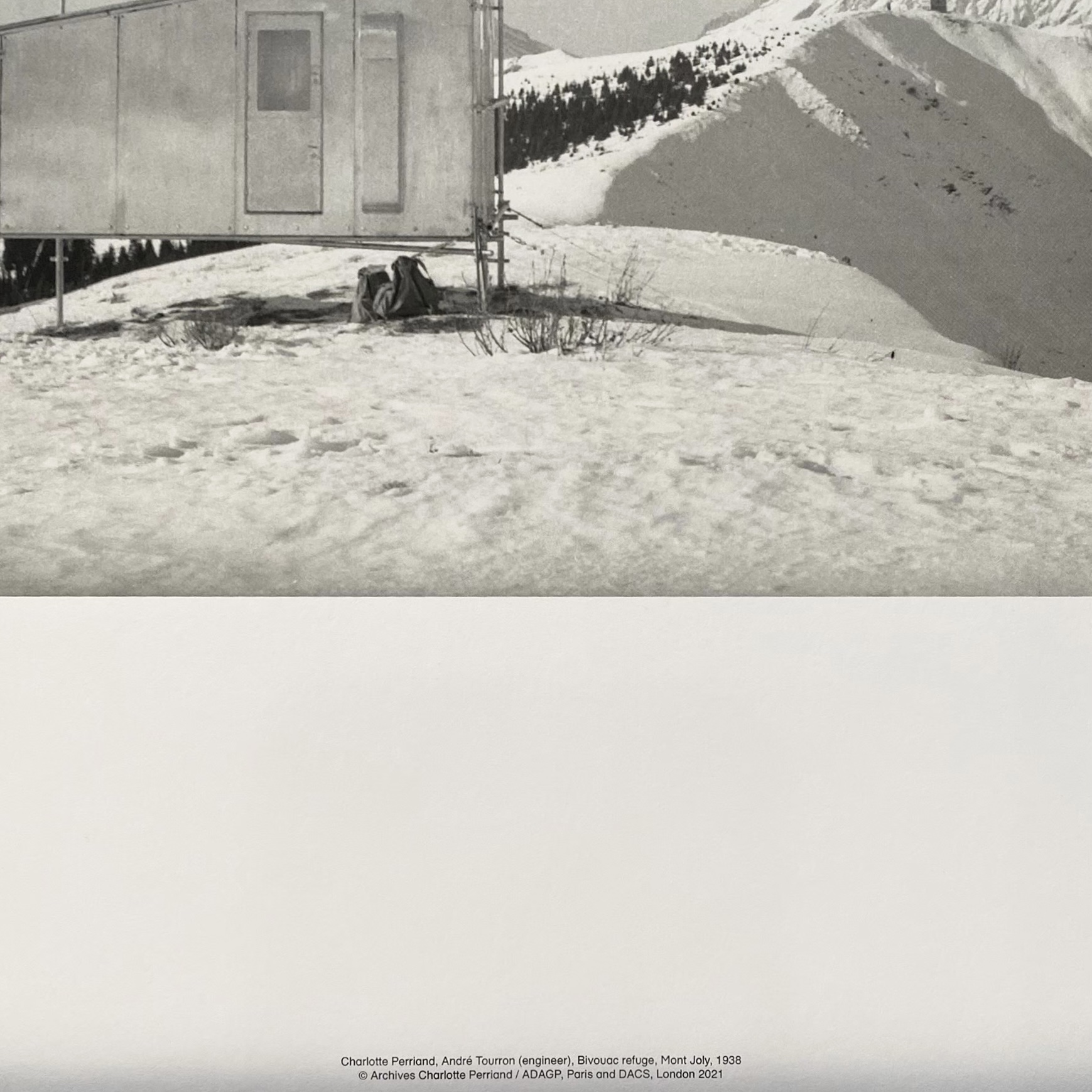 1938年、ペリアンがジャンヌレと一緒に設計したポータブル「避難所」のポスター。原画から初めてここに建設された。田舎や山のどこにでも建設することができる暖かい木製のインテリアを持つ八角形のアルミニウムで覆われたカプセル。