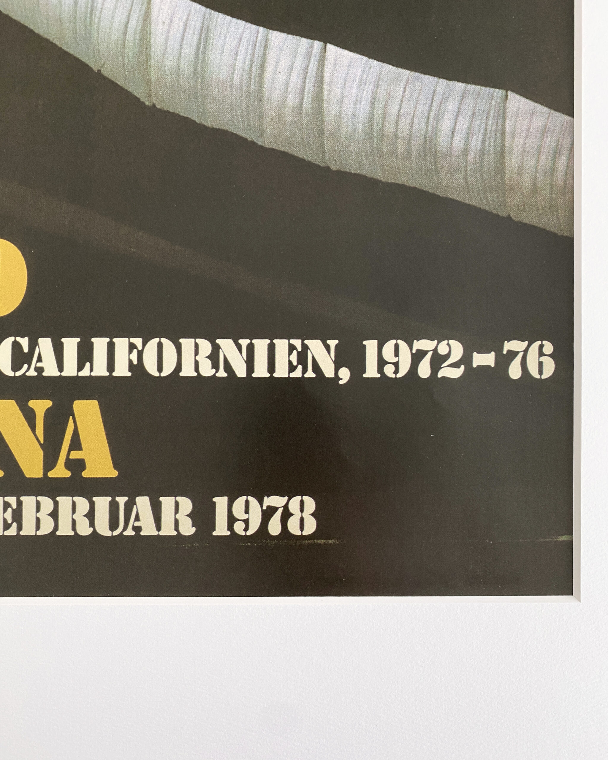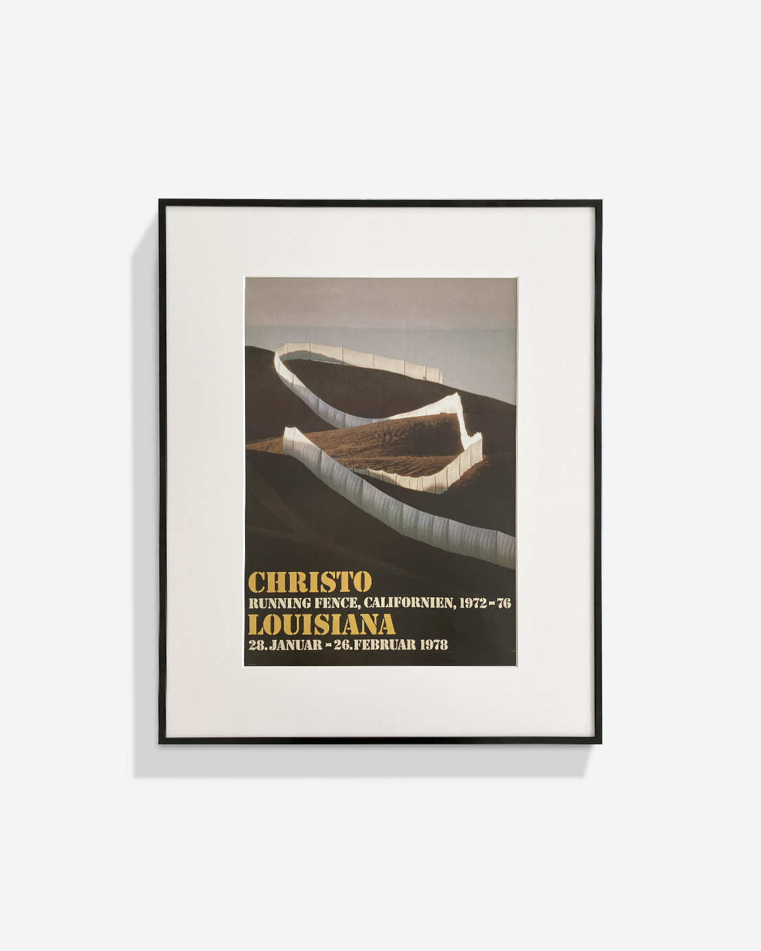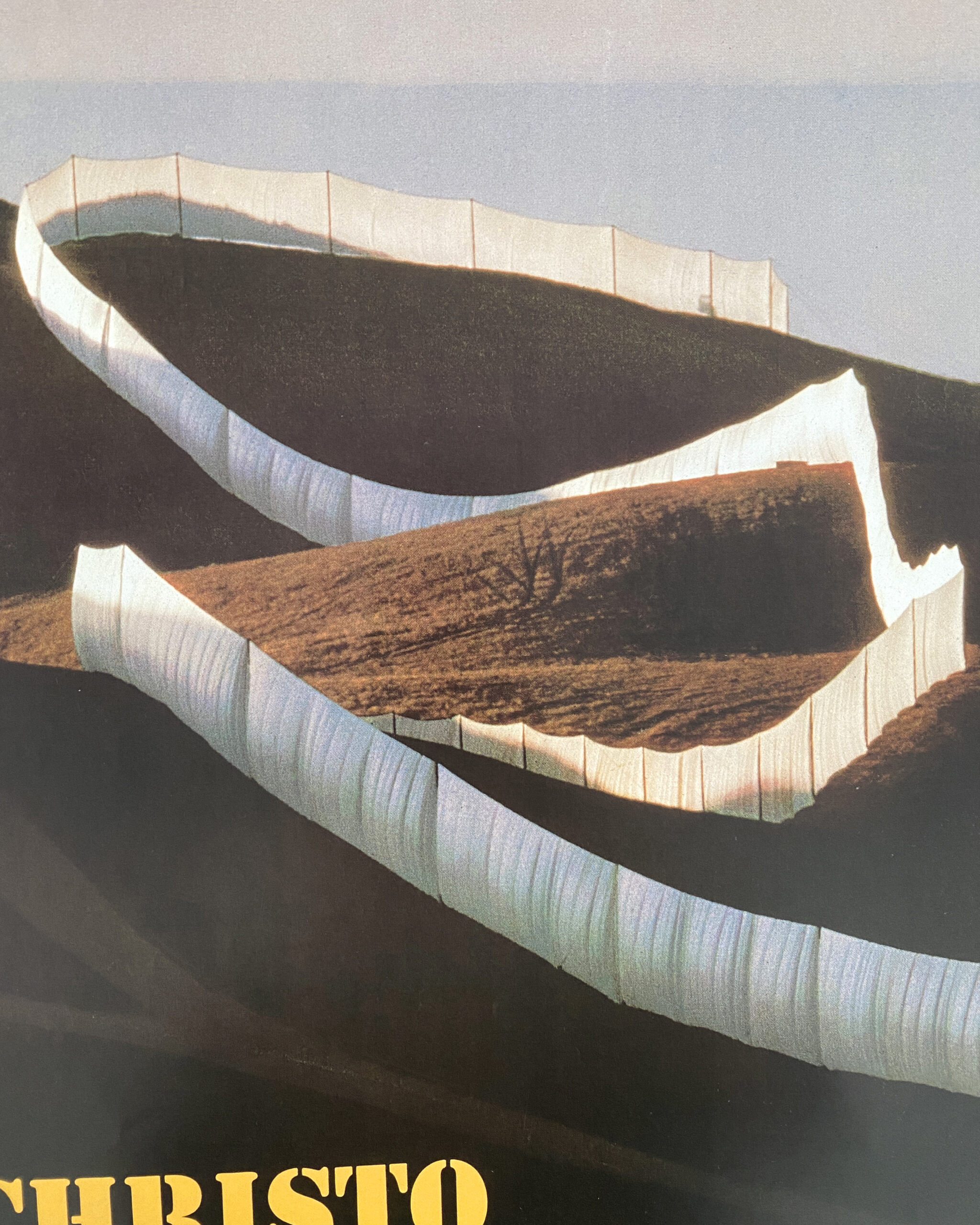 ブルガリア系アメリカ人の芸術家、クリスト(1935-2020)による作品、カリフォルニア州ランニングフェンス(1972-76)の展示ポスター。 1978年のルイジアナの展示会では、クリストのカリフォルニアのドキュメント「ランニングフェンス」が示された。クリ数年の準備の後、海岸から内陸40キロメートル、高度5.5メートルで、2000本のマストに吊るされた白いナイロン生地の作品。