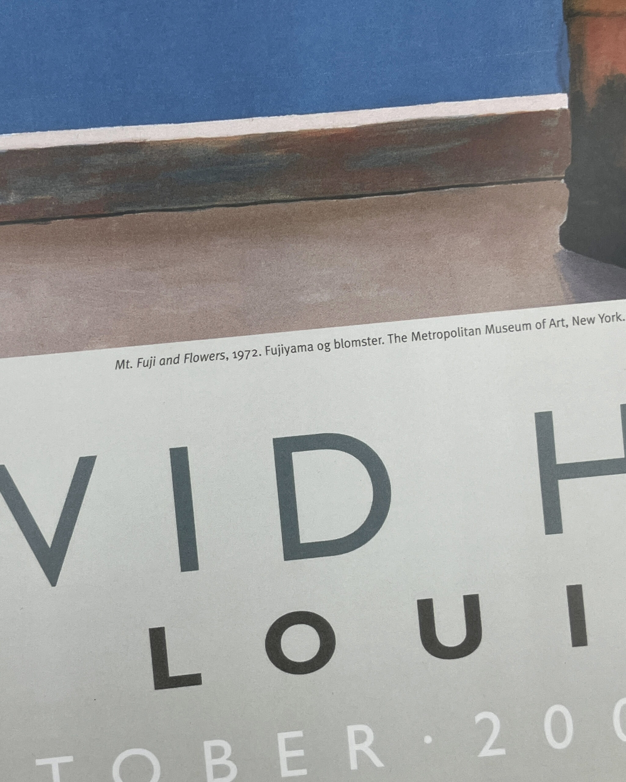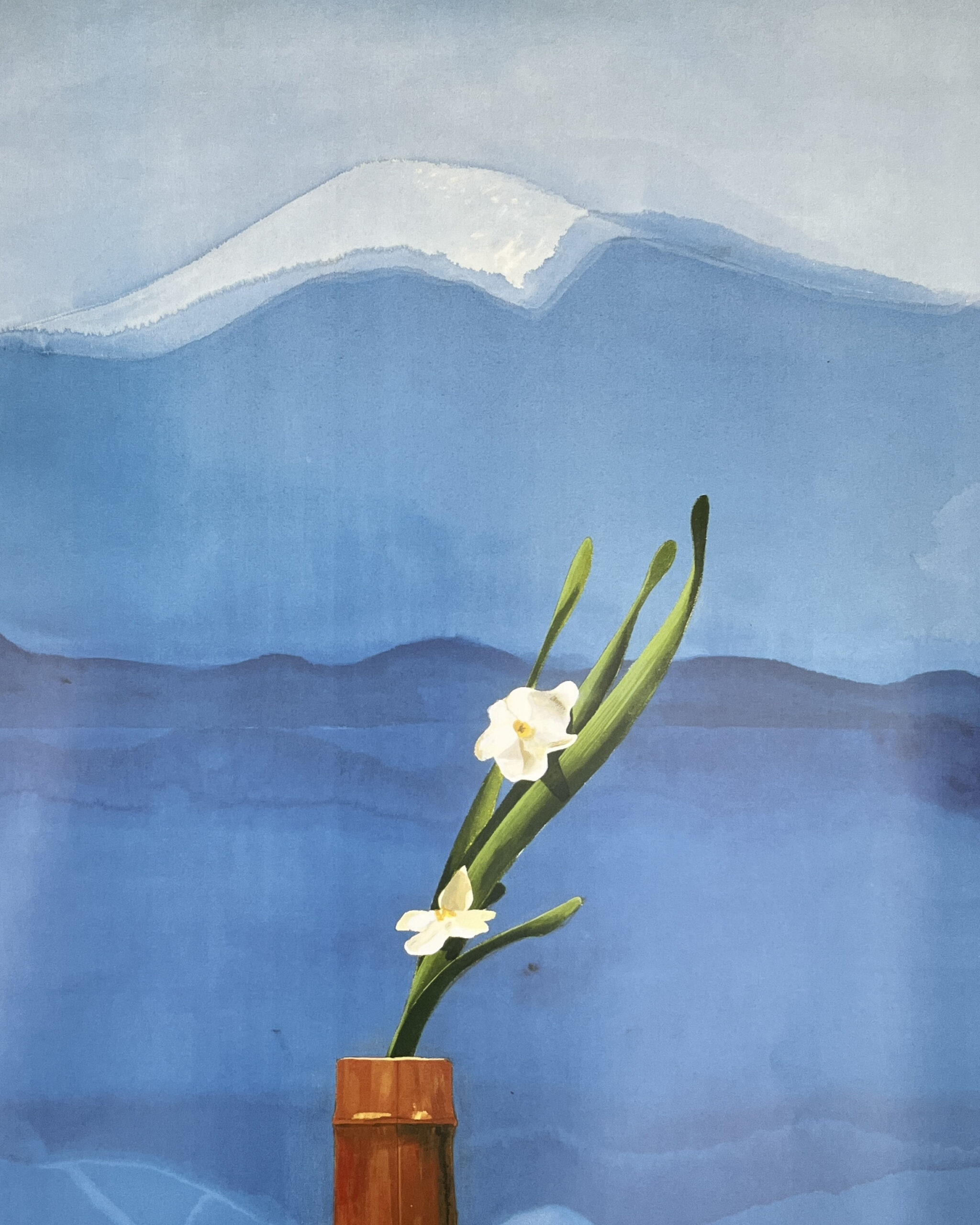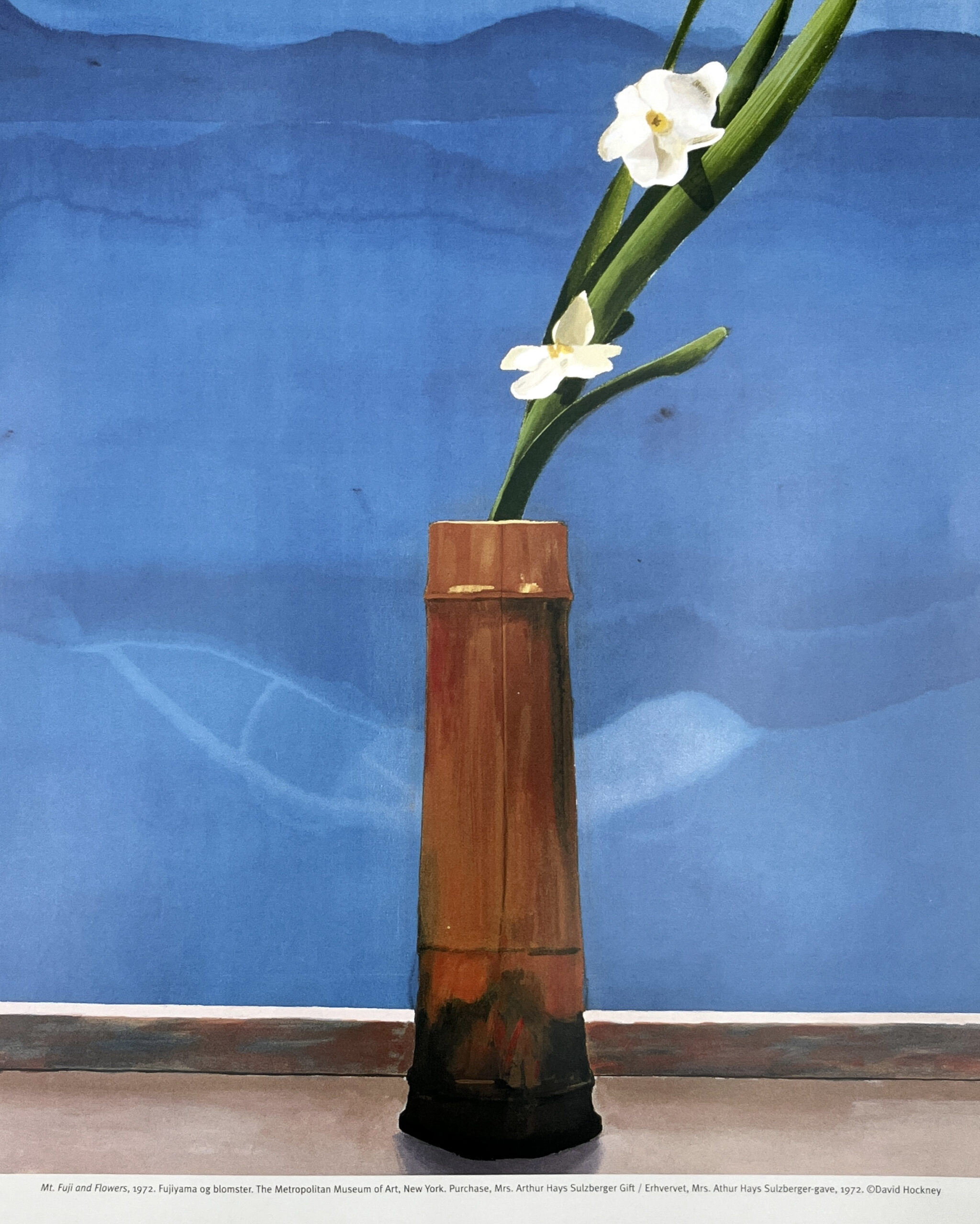 富士山と花。2001-2002年に開催された展覧会DavidHockney-Painting1960-2000に関連して制作された。デイヴィッド・ホックニー(1937年生まれ)は、20世紀の英国で最も影響力のあるアーティストの一人であり、ロンドンの60年代のポップアートシーンの中心人物。