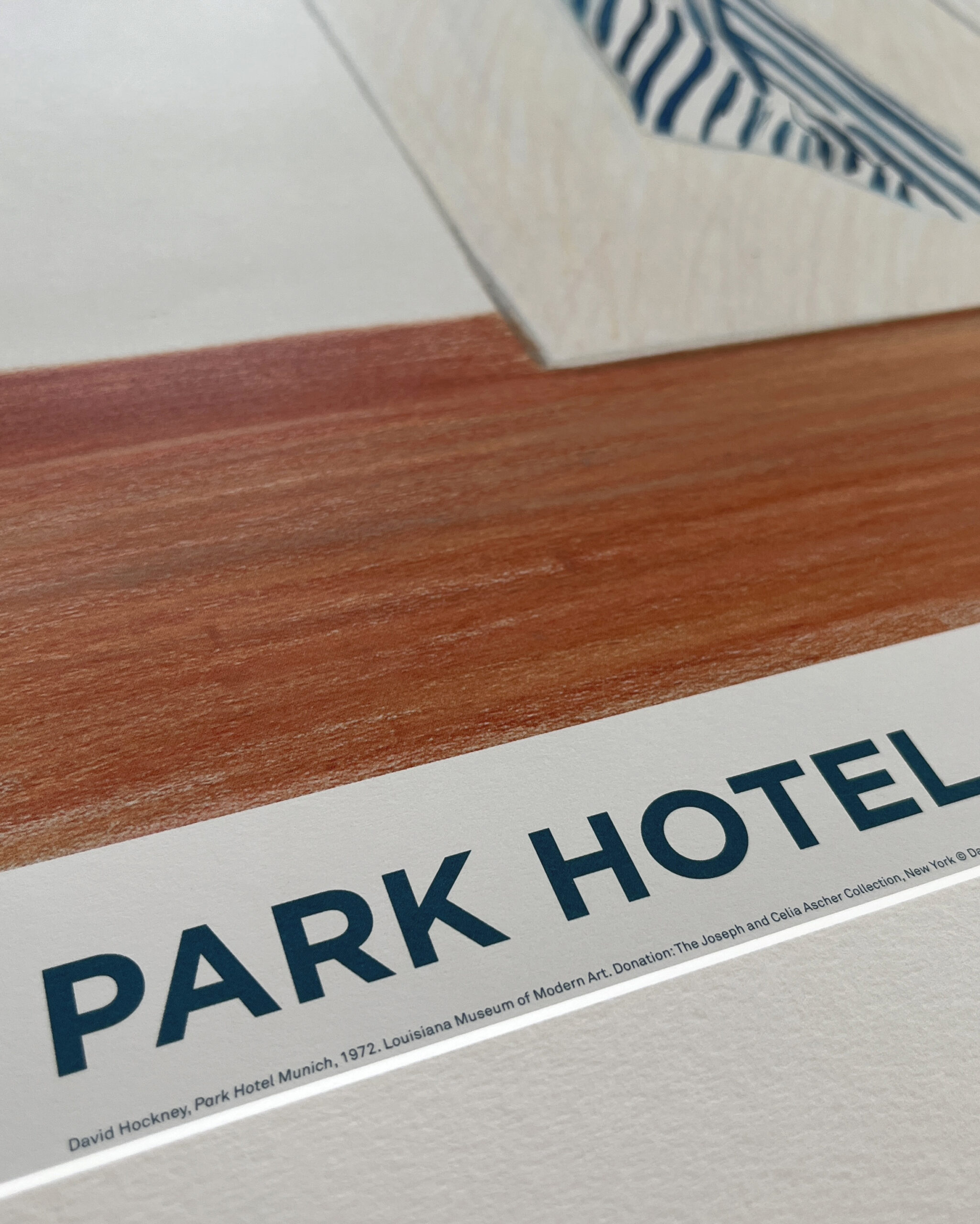 アーティストのデイヴィッド・ホックニー(1937年生まれ)による作品、パークホテルミュンヘン(1972年)の作品を使用したポスター。