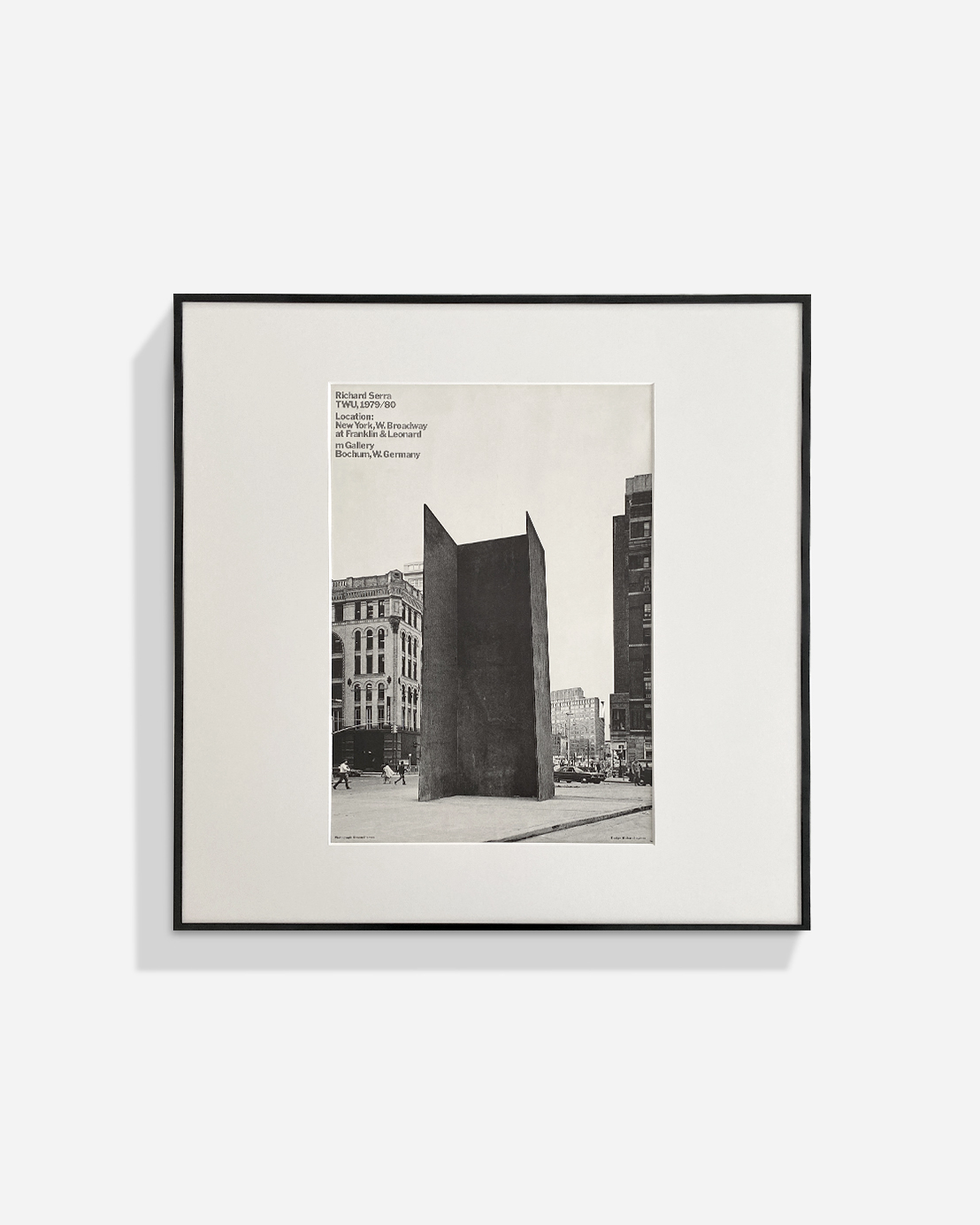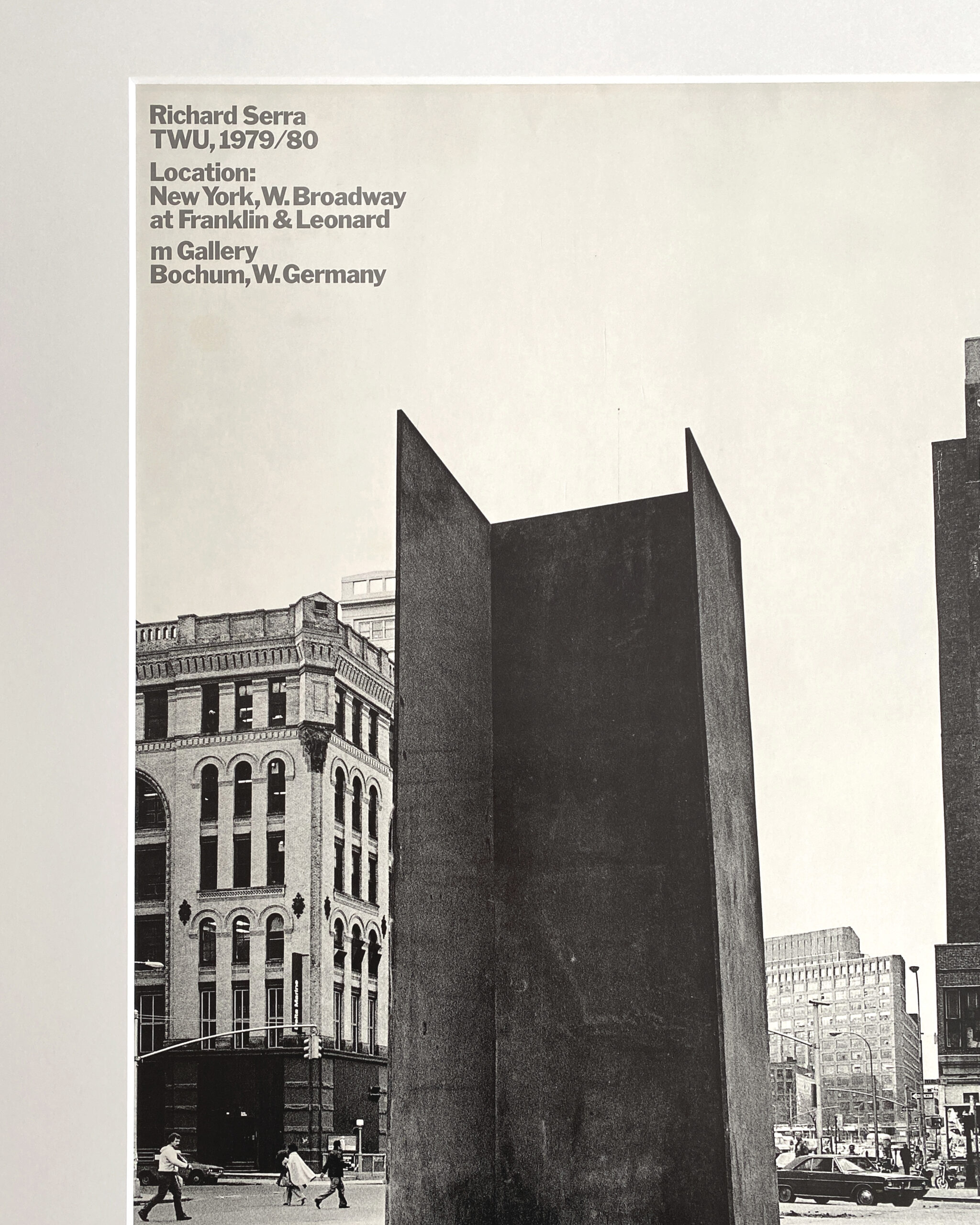 NYでかつて実在したリチャード・セラの彫刻作品のために作成されたポスター。ウェストブロードウェイ付近に設置された作品。彼の巨大な作品と当時のNYの風景が素敵なオリジナルポスター。薄紙に印刷された郵送バージョンではなく、厚紙に印刷されたスペシャルな一枚。もう一枚のポスターとぜひ2枚並べて飾ってほしい。